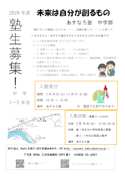 2026年度の入塾希望を受け付ます。 2026年度 塾生募集チラシ(PDFデータ)を ご覧になりたい方は,左のチラシをクリックしてください。 入塾受付は、2月24日(火)~2月27日(金) 3月2日(火)~3月6日(金)の16:00~18:00に 0824-55-6301 に連絡してください。